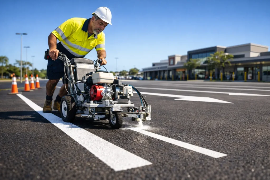 Professional commercial line marking for retail centres, schools and strata properties across Brisbane.