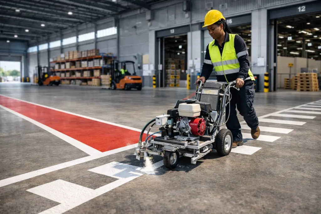 Heavy-duty industrial line marking solutions for Brisbane factories and logistics facilities.